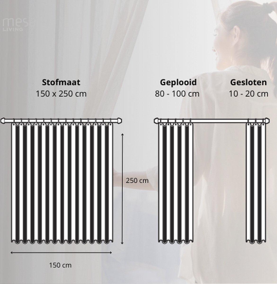 Houd er rekening mee dat de gordijnen in plooi hangen. Hierdoor wordt de breedte van het gordijn ongeveer gehalveerd. Voorbeeld: voor een kozijn met breedte van 150cm bestel je 1 gordijn van 300cm breed voor het openen naar 1 zijde, of 2 stuks van 150cm breed om ze in het midden naar 2 zijdes open te schuiven.